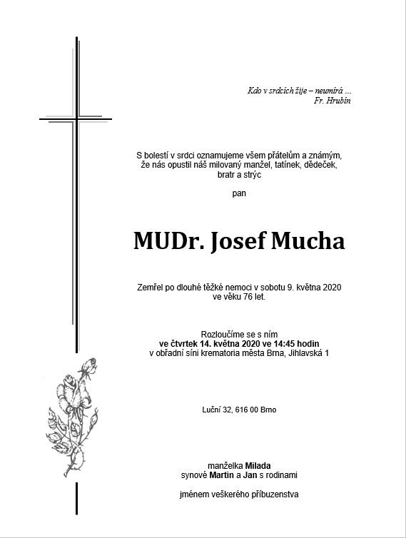 A přesně takový byl PAN DOKTOR Mucha. Osvícený, vzdělaný, empatický. Pracoval rád a s chutí. Pro mnohé z nás byl velkou inspirací a vzorem, za vše mu děkujeme. Bude nám chybět.