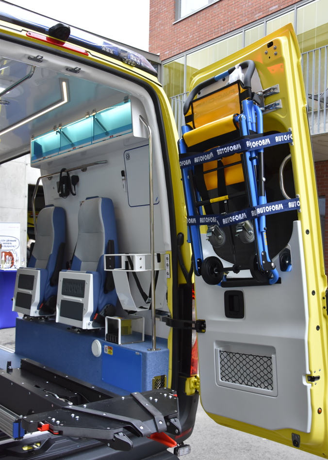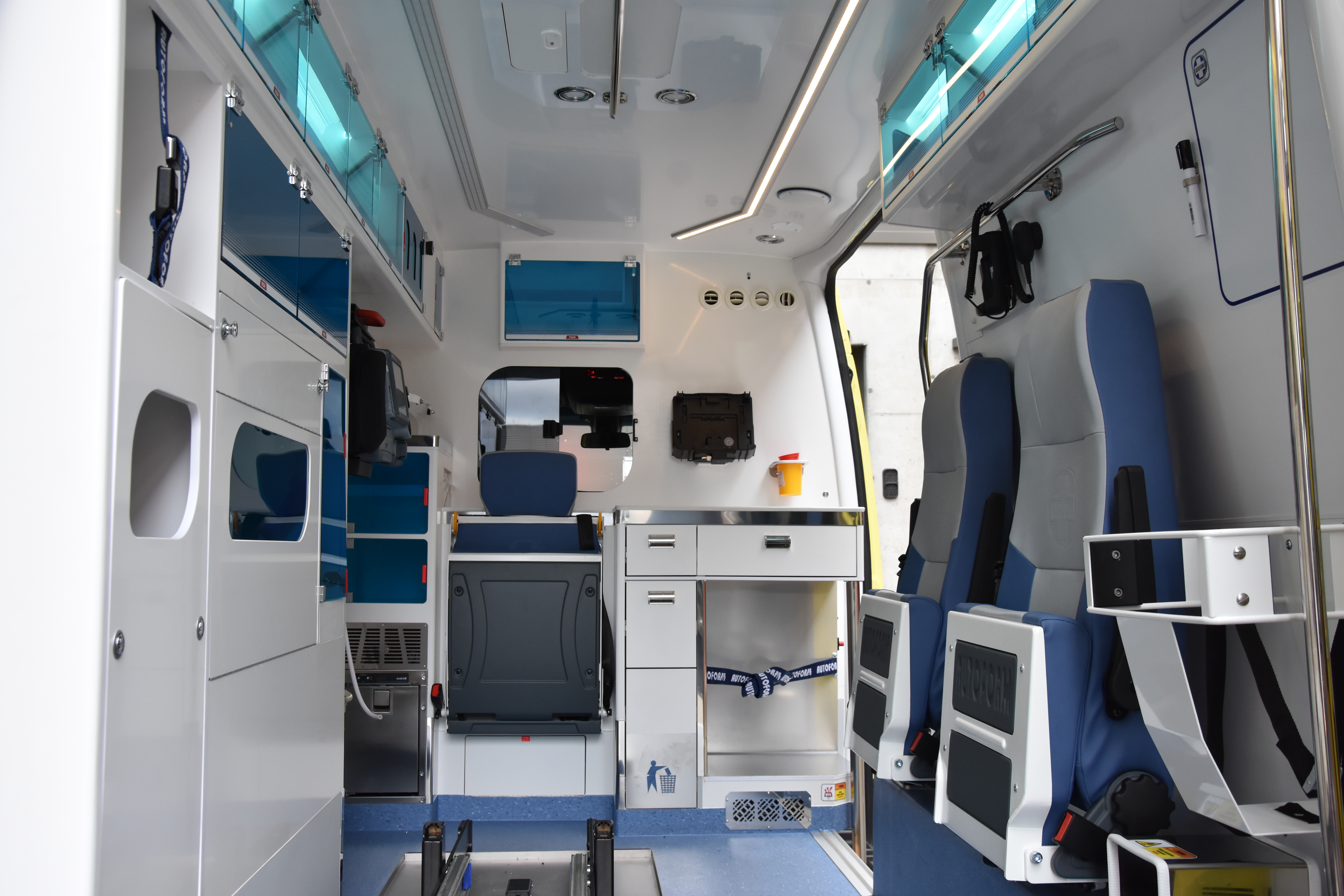 Ve vozidle je monitor životních funkcí s defibrilátorem, tento přístroj měří krevní tlak, dokáže vyhotovit záznam EKG a také například vyhodnotí procentuální množství kyslíku nebo oxidu uhelnatého v krvi. Dále je tu přístroj pro umělou plicní ventilaci dospělých i novorozenců. V sanitce má posádka k dispozici také videolaryngoskop, skládací páteřní rám, extenční dlahu, digitální teploměr, glukometr, vakuovou matraci, dlahy pro znehybnění poraněných částí těla, box pro léky, detektor plynu, který pomůže rozpoznat hladinu oxidu uhelnatého v prostředí, a další zdravotnické přístroje a speciální materiál. „V rámci snahy usnadnit práci posádkám jsme do této sanitky umístili hydraulická nosítka a drobných změn doznala i vnitřní zástavba vozu. Například plnohodnotná sedačka za hlavou pacienta, změna umístění tiskárny či uzavíratelný prostor pro vakuovou matraci. Pokud se tyto změny osvědčí, budeme je v budoucnu aplikovat i v dalších vozidlech,“ doplňuje Hana Albrechtová.