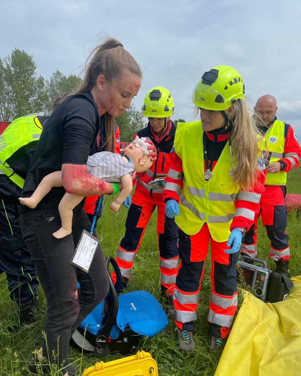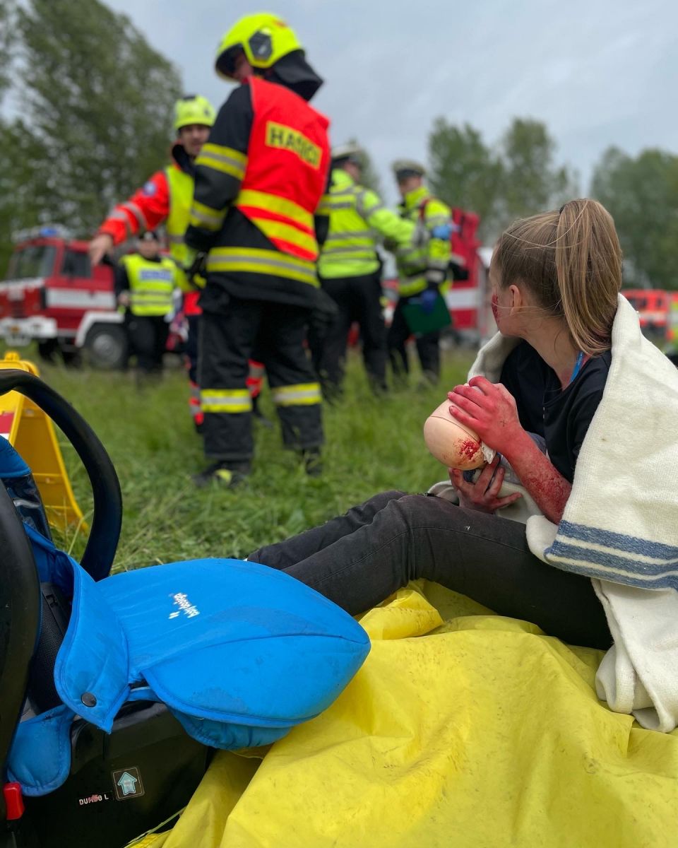 Dopravní nehoda dvou autobusů, tří osobních automobilů a jedné dodávky převážející nebezpečný náklad. Složitá dopravní situace, asi okolo 30 zraněných - mezi nimi i kojenec. Všude křik, pláč.