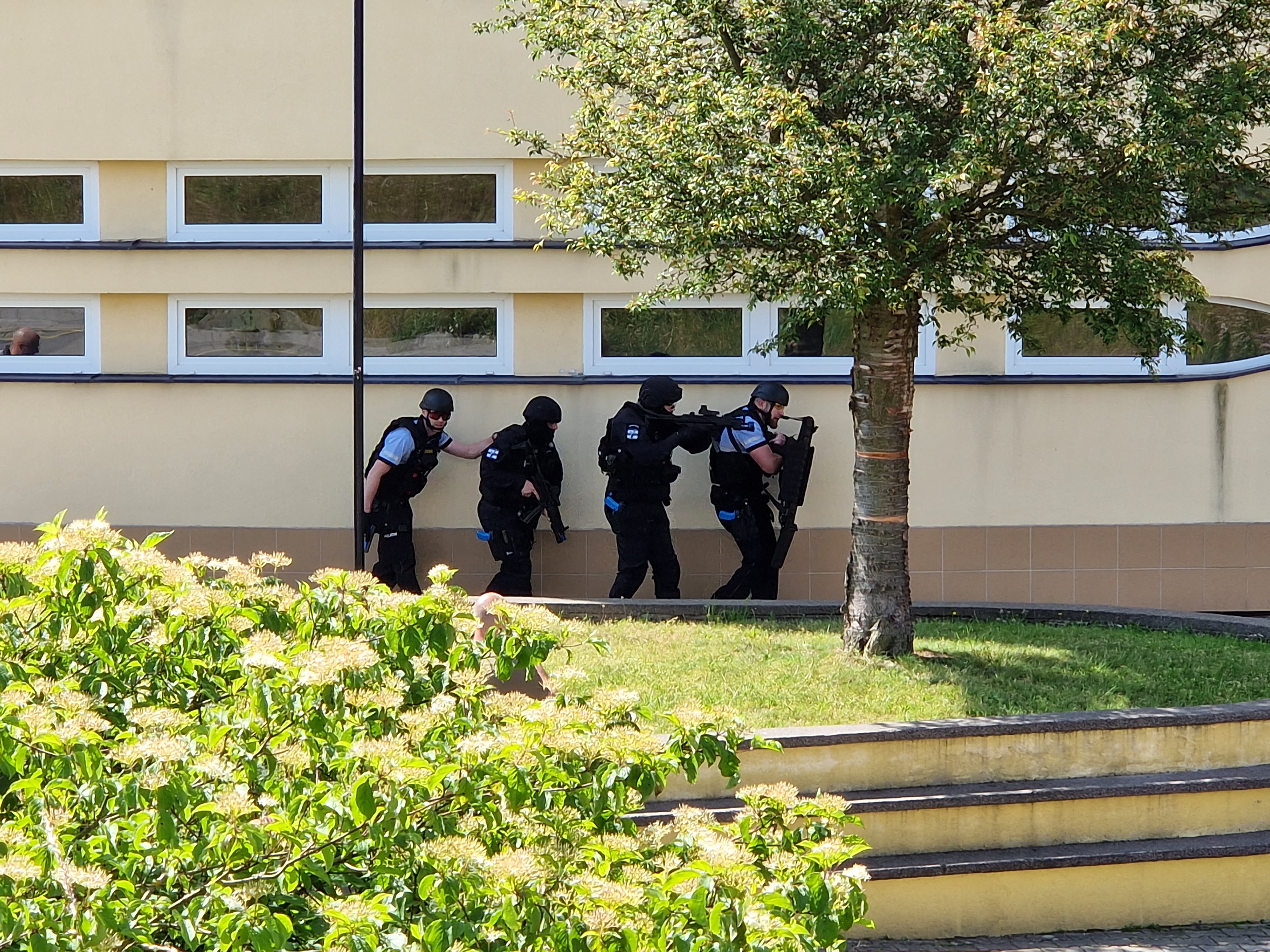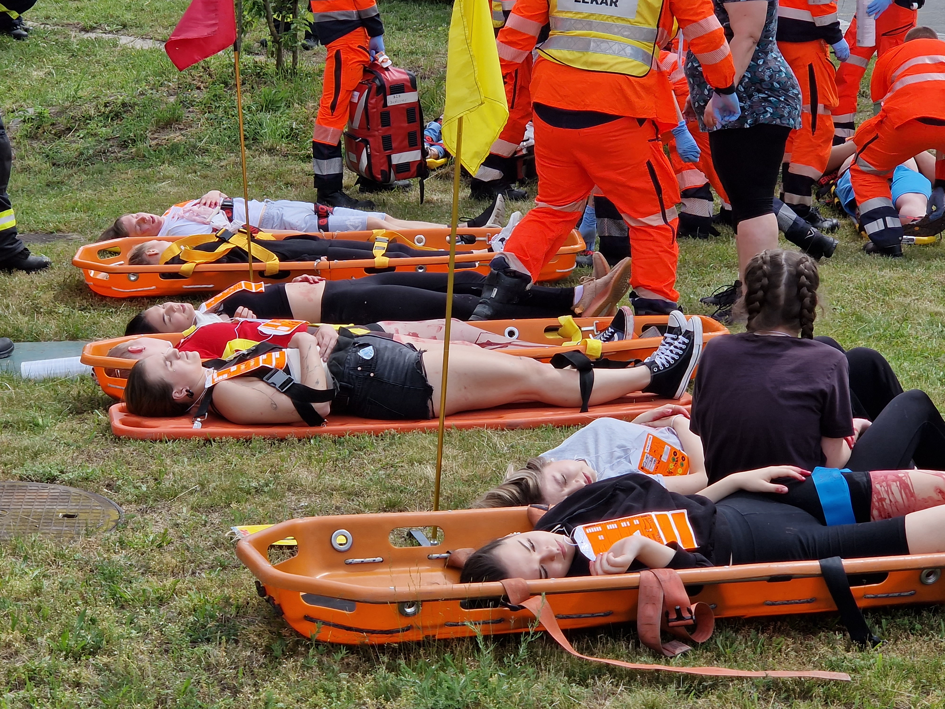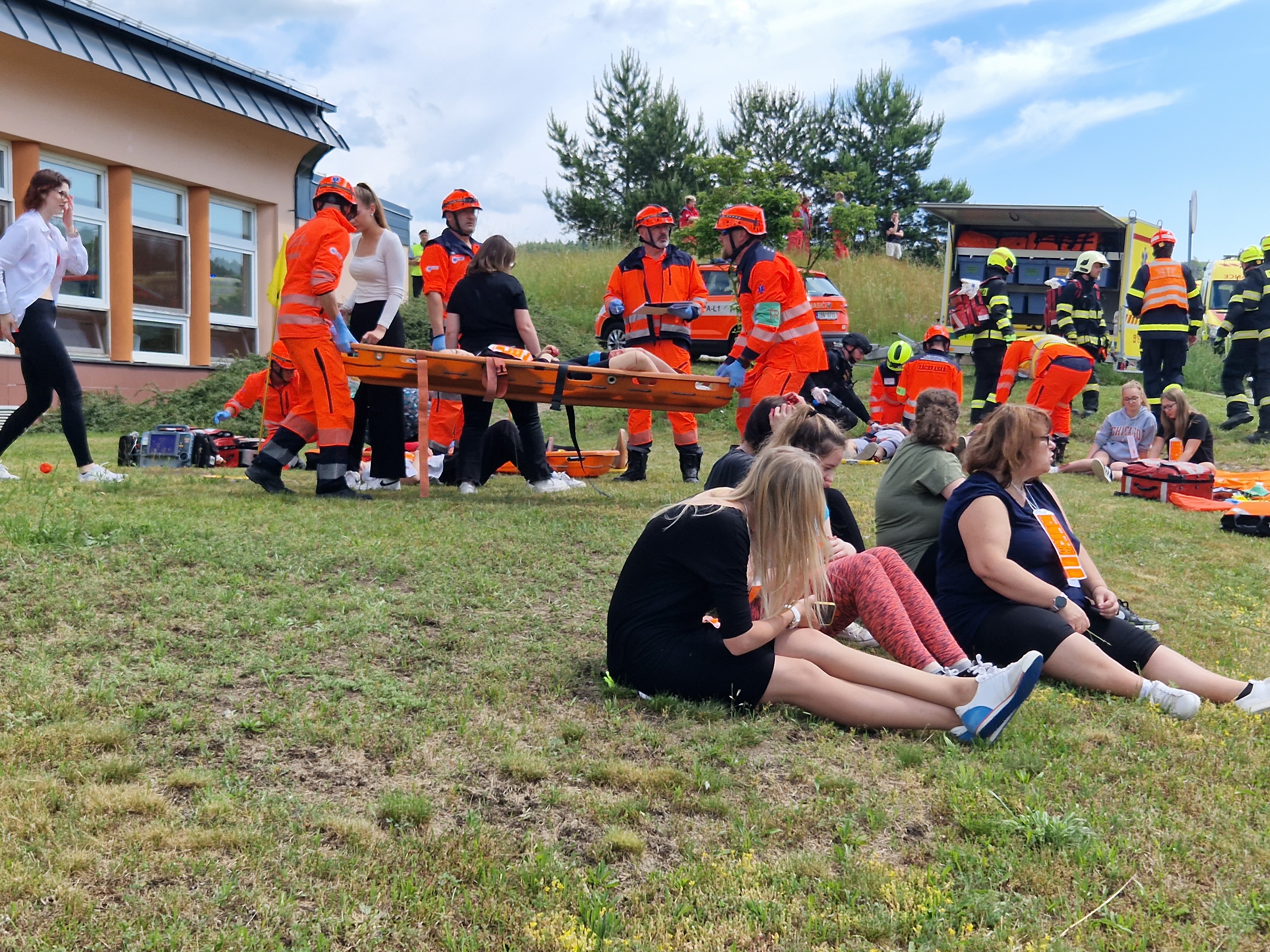 Operační středisko vyslalo k zásahu postupně celkem 12 posádek, byly mezi nimi lékařské i záchranářské týmy, ale také velkokapacitní sanitka a inspektor provozu. Prostředky ovšem nezamířily přímo ke škole, nejprve zůstaly na tzv. setkávacím místě a bylo nutné počkat, až budou útočníci policií zajištěni. Ve chvíli, kdy zdravotníci obdrželi od policistů zprávu, že je prostor bezpečný, dojeli až k budově a začali ošetřovat pacienty. Byly jich na tři desítky, v některých případech šlo o těžká zranění a jeden člověk útok agresorů nepřežil.