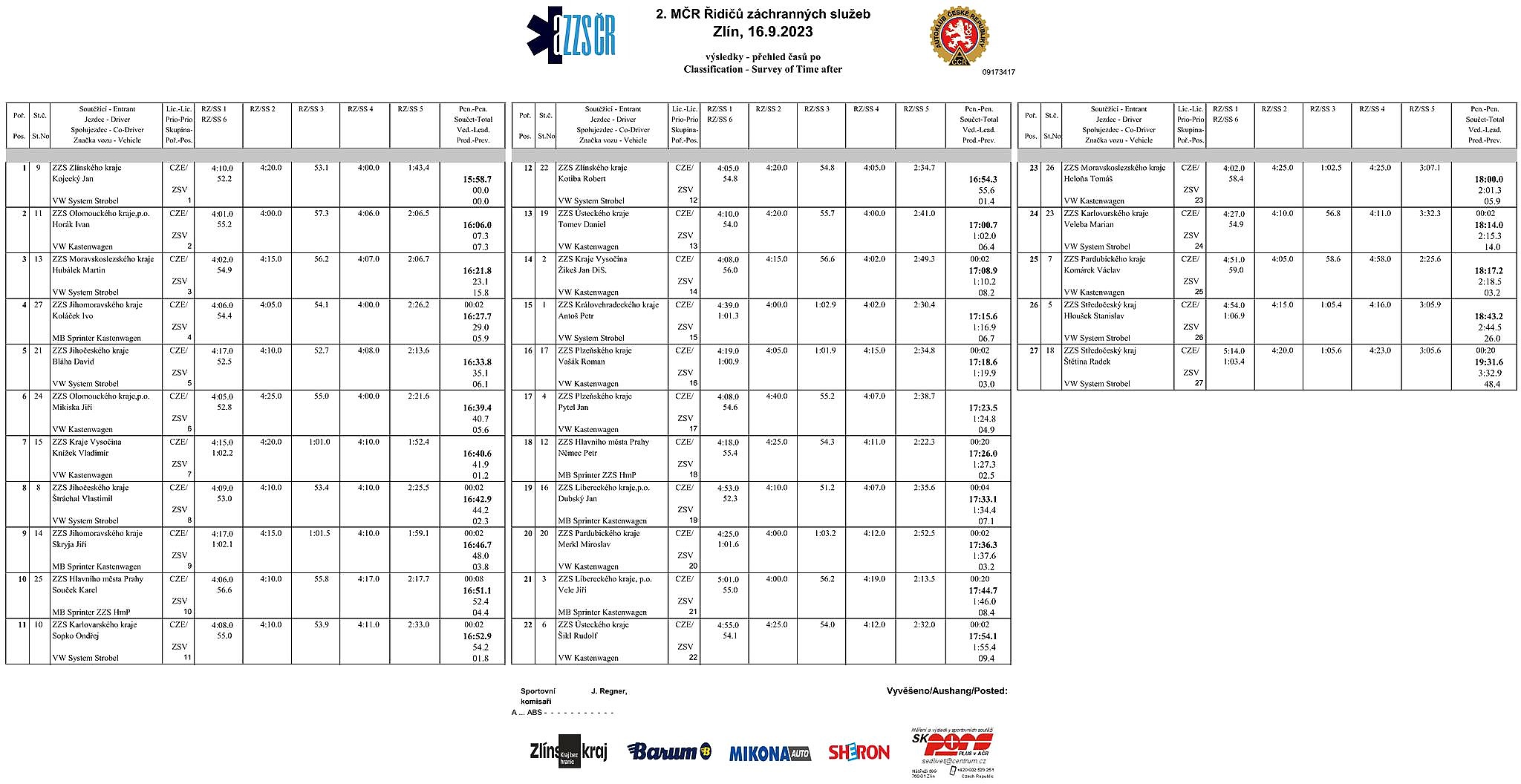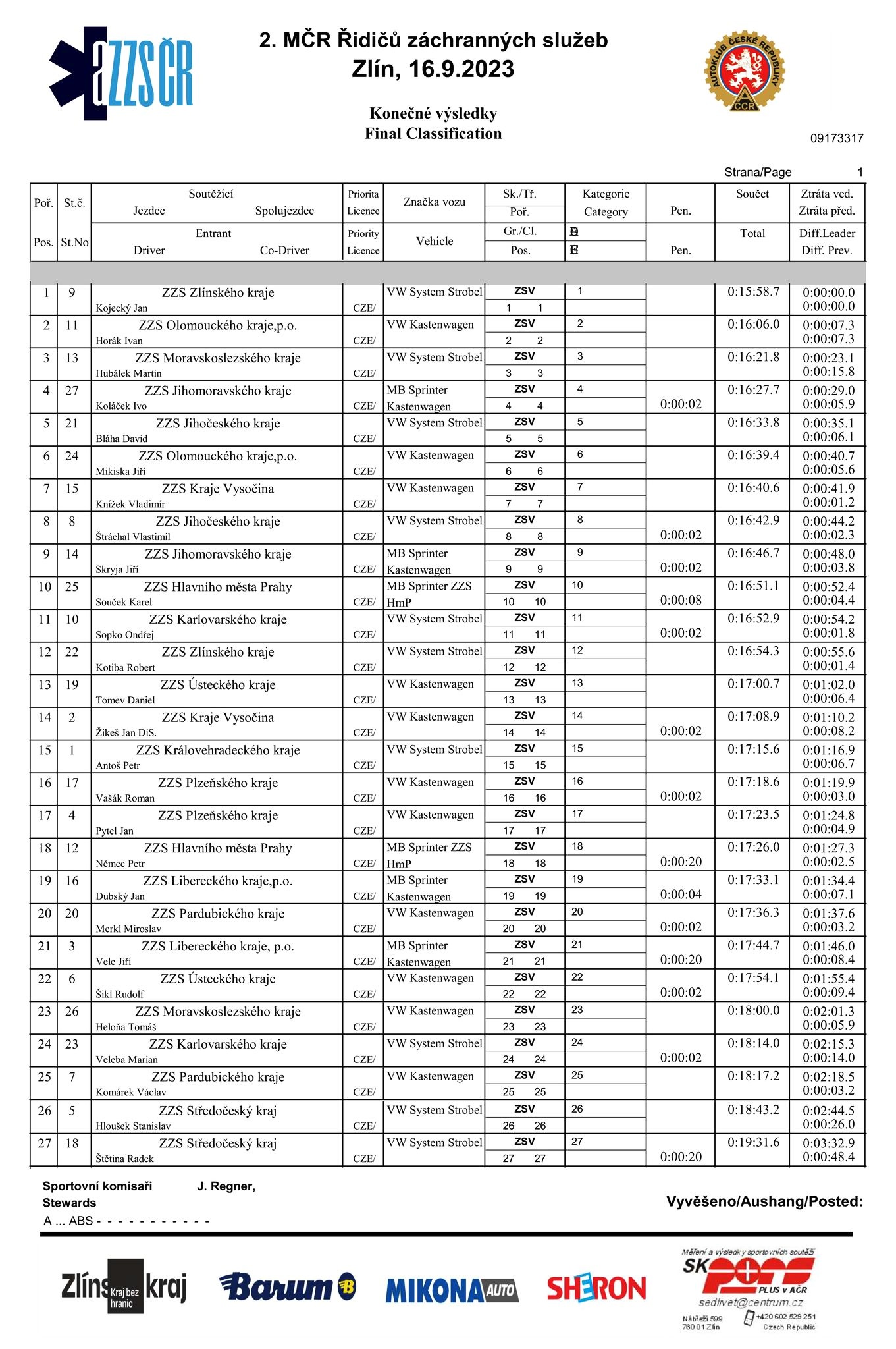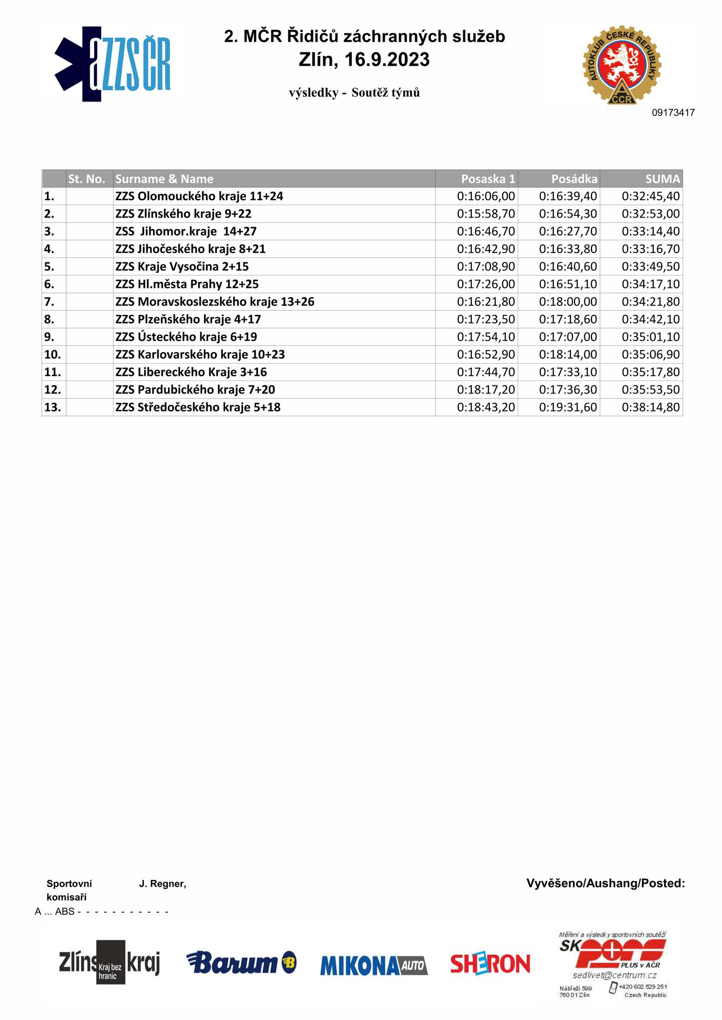 V kategorii týmů reprezentující jednotlivé krajské záchranky se na prvním místě umístili řidiči z Olomouckého kraje, druzí byli ze Zlínského kraje, třetí z kraje Jihomoravského.